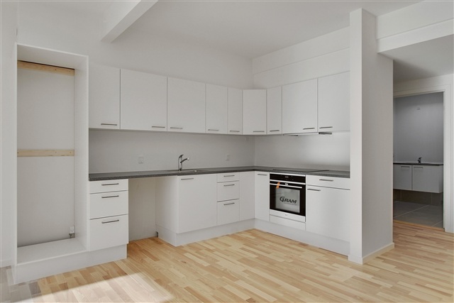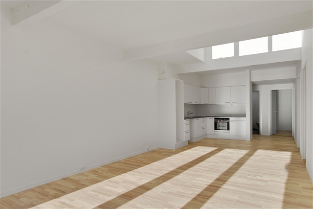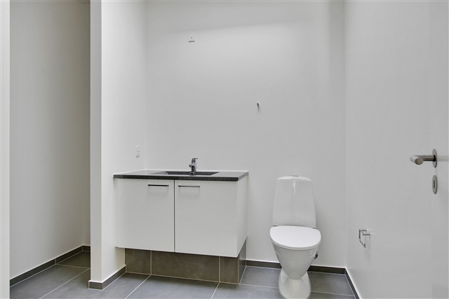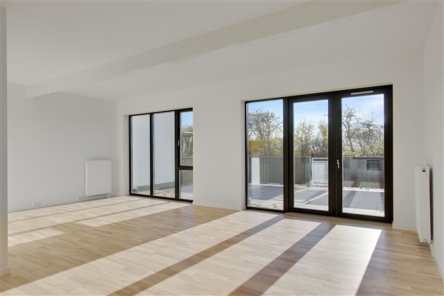 Bemærk venligst, at billederne udelukkende fungerer som vejledning vedrørende farvevalg og materialer, da de er taget i en af de andre lejligheder på ejendommen. Denne bolig fremstår lys og imødekommende med et moderne udtryk, hvilket blandt andet kommer til udtryk i store vinduer fra gulv til loft samt ovenlys, der sikrer et godt lysindfald. Til boligen hører der en privat, indhegnet terrasse samt et kælderrum til ekstra opbevaring.Opvarmningen foregår ved brug af naturgas, og der er mulighed for at opnå tilladelse til at holde både hund og kat i lejemålet. Placeringen er praktisk i forhold til nærhed til vuggestue, sportshal og flere indkøbsmuligheder. Der er desuden gode parkeringsmuligheder i området, som gør det nemt at parkere tæt på boligen.