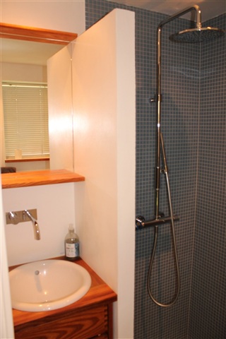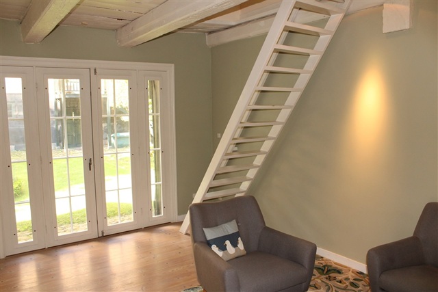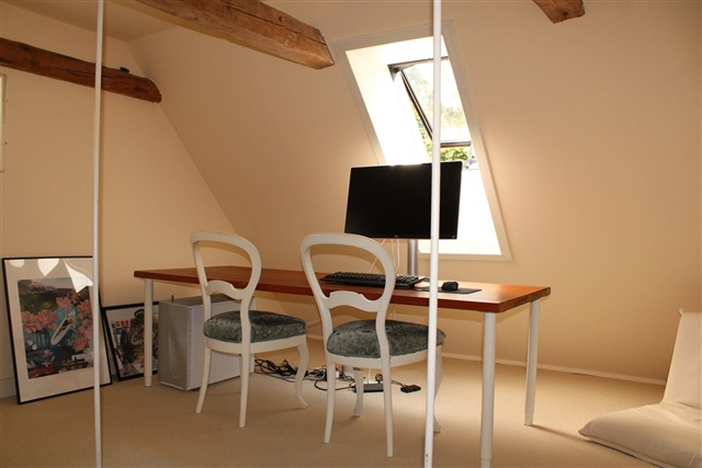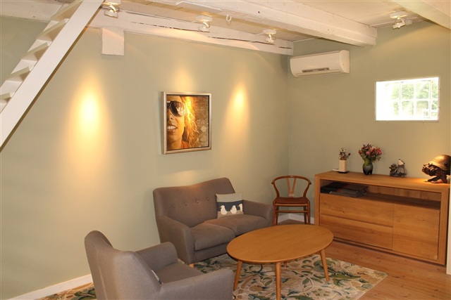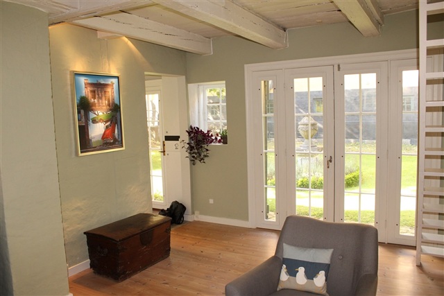 På første sal er der et forrum, som både fungerer som arbejdsområde med skrivebord og som et behageligt tv-hjørne. Herudover er der et separat soveværelse med dobbeltseng og integrerede skabe til opbevaring. Fra husets dørtrin strækker en stor have/park sig, som tilfører ekstra plads og en naturskøn atmosfære.