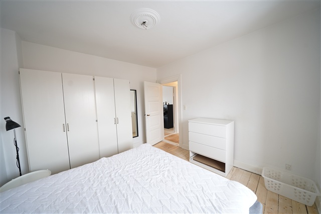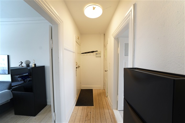 Lejligheden indeholder en rummelig fordelingsgang, hvor man har adgang til alle lejlighedens rum og plads til at hænge overtøjet. Lejligheden har en stor lyse stue med stuk og roset i loftet. Stuen er let at indrette med det store regulære rum. I stuen er der et stort vinduesparti som giver et fantastisk lysindfald. Soveværelset vender ind mod gården og indeholder store faste skabe, med masser af opbevaringsplads og et dejligt stort vindue. I køkkenet er der ovn, komfur, emhætte, og køle/fryseskab. Lejligheden har eget badeværelse med toilet og brus.