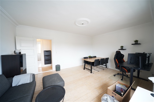 I hele lejligheden er der flotte lyse trægulve og højt til loftet. Der er et utroligt godt lysindfald i hele lejligheden, idet der ikke er en høj ejendom uden for vinduerne.