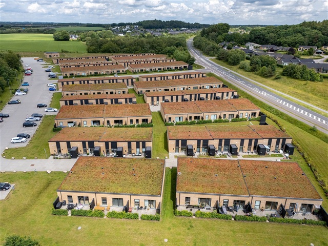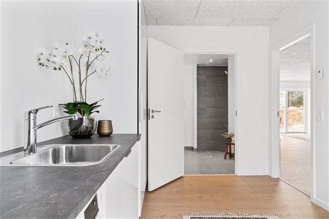 Ved indgangen møder man en rummelig entré, der er integreret med bryggerset, hvor der er god plads til sko og overtøj samt vaskemaskine og tørretumbler - en praktisk løsning til hverdagen. Udenfor bidrager de dejlige udendørs arealer til afslapning og samvær, især den ugenerte terrasse omgivet af grønne omgivelser. Foran huset findes et redskabsskur til opbevaring, og fælles parkeringsarealer ligger tæt ved, hvor der også er installeret ladestander til elbil, så opladning kan ske nemt i hjemmets nærhed.