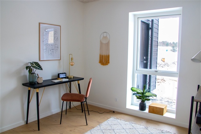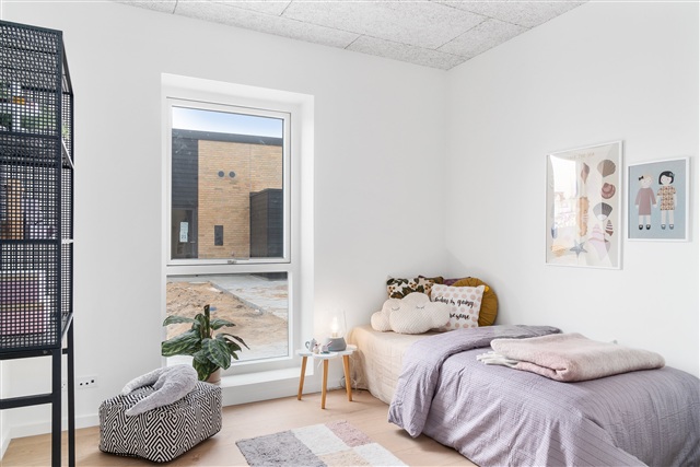 Boligens tre værelser tilbyder alsidig indretning. Hovedsoveværelset har faste skabe og er adskilt fra opholdsrummene, hvilket sikrer privathed. De øvrige to værelser kan anvendes som børneværelser, kontor eller gæsteværelser, alle med godt lysindfald og en behagelig atmosfære. Badeværelset er stilrent og funktionelt udført med lyse materialer og indeholder en bruseniche, håndvask, toilet samt praktisk opbevaringsplads til daglig brug.