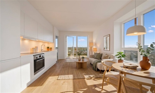 Denne bolig byder på et lyst og moderne hjem, hvor både funktionalitet og æstetik er nøje integreret i hver enkelt kvadratmeter. Altanen fremstår som et yndet sted, der hurtigt bliver velegnet til både morgenens første kop kaffe og lange sommeraftener i afslappende omgivelser.Det store opholdsrum samler køkken og stue i ét åbent rum, hvilket skaber et naturligt midtpunkt, der egner sig til både dagligdagens gøremål og besøg af gæster. Køkkenet, der er leveret af HTH, er udført i tidløse hvide materialer med integrerede hårde hvidevarer og rigelig opbevaringsplads. Fra rummet er der direkte udgang til altanen, som er et perfekt sted til både solrige frokoster og små pauser i løbet af dagen.