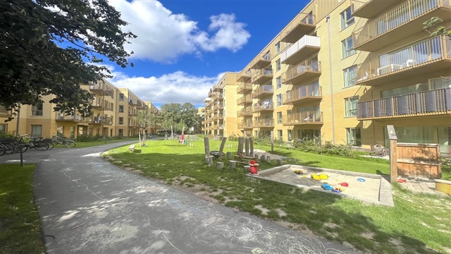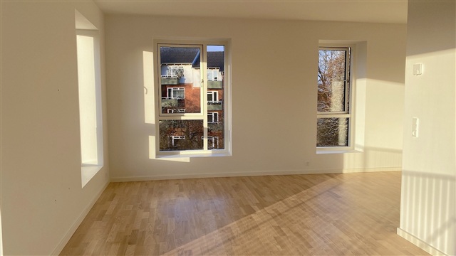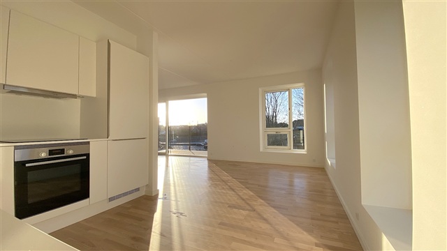 Boligen indeholder en entré, hvorfra adgang til soveværelset findes i den ene side. Længere inde ligger badeværelset, som er udstyret med toilet, bruseniche samt installationer til vaskemaskine og tørretumbler. En mellemgang fører videre til det åbne køkken- og stueområde, der opleves som rummeligt. Fra stuen er der udgang til en terrasse med placering mod syd, som bidrager til hyggelige udendørsrammer. Ejendommen er beliggende i nærheden af gode indkøbsmuligheder, offentlig transport, skole og dagtilbud samt parker og grønne arealer. Bemærk venligst, at billederne ikke viser den specifikke lejlighed, men en anden bolig med tilsvarende plantegning og indretning.