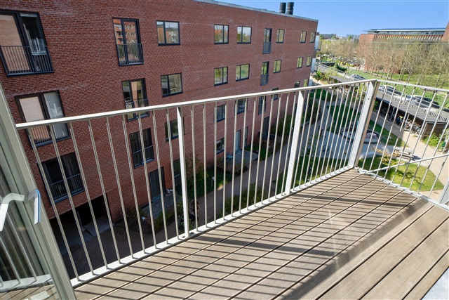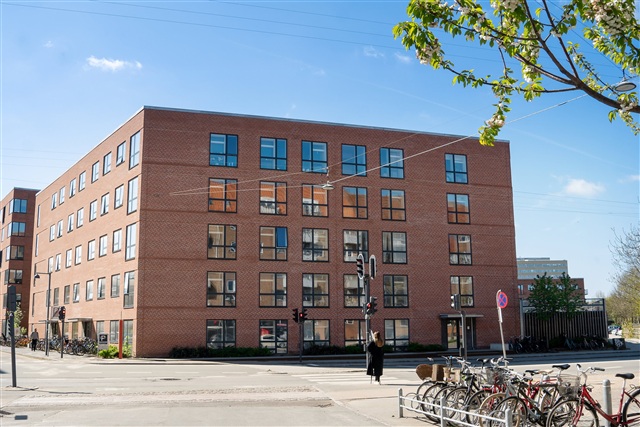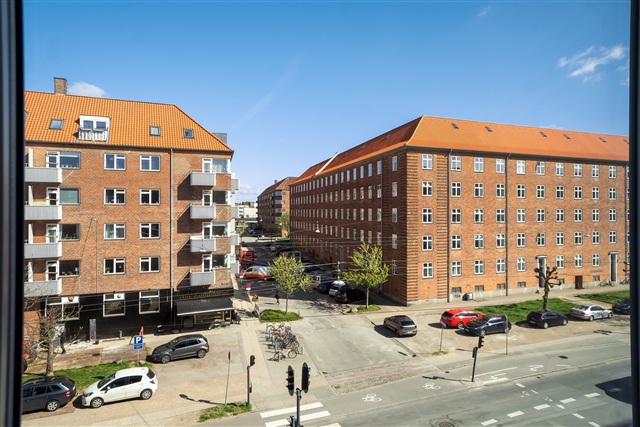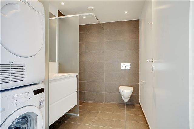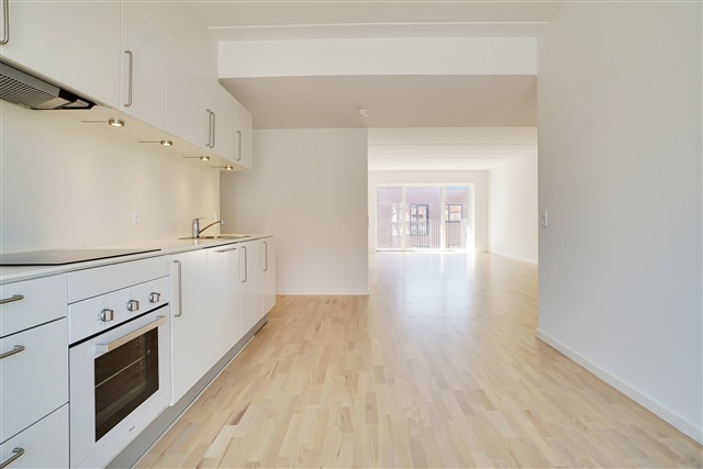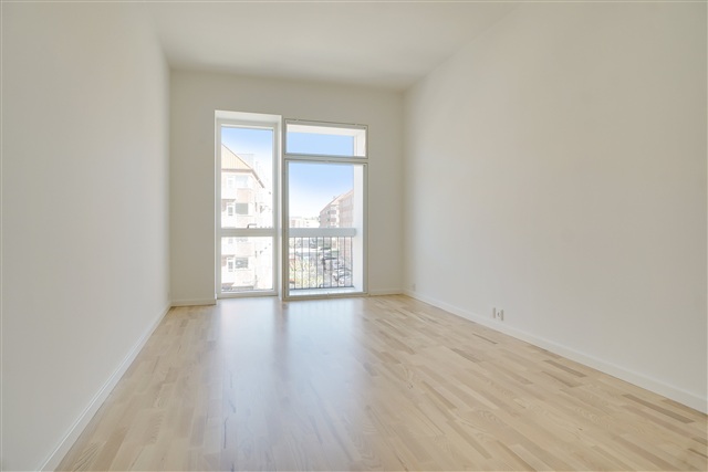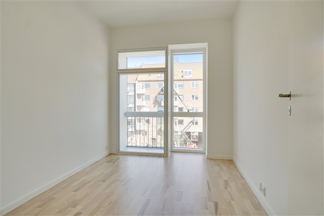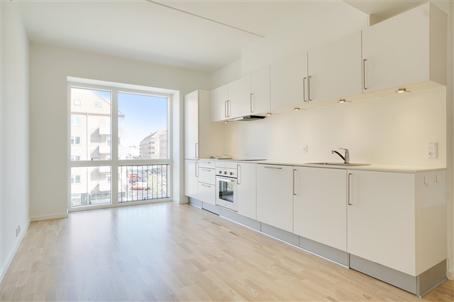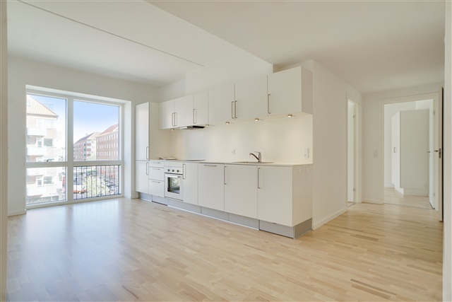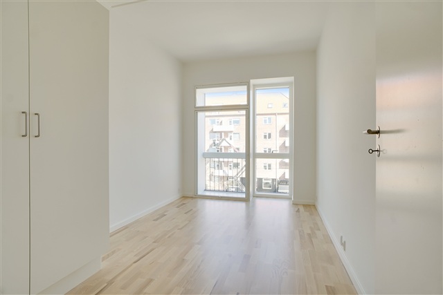 I hjertet af Valby ligger denne nyopførte ejendom, hvor du finder en attraktiv lejlighed med en gennemtænkt planløsning og materialer af høj kvalitet. Boligen byder på et antal værelser, der passer særligt godt til såvel par som mindre familier. Byggeriets arkitektur kombinerer en murstensfacade med metalbeklædning på den øverste etage, hvilket giver facaden et råt og markant udtryk. Fra facaden brydes monotonien af store vinduespartier og altaner, som tilfører variation og lys til boligen.Indgangen fører direkte ind i en åben entré med god opbevaringsplads i et integreret skab til overtøj. Badeværelset rummer en bruseniche samt plads til en vaskesøjle, der gør hverdagen nem og praktisk. Det rummelige soveværelse imponerer med sin størrelse og det flotte dagslys, der strømmer ind. Lejlighedens opholdsrum udmærker sig ved at være lyst og moderne med smukke trægulve og store vinduespartier. Køkkenet er elegant indrettet langs den ene væg for at skabe mest mulig plads, og hele rummet åbner op for mange forskellige møbleringsmuligheder. Fra stuen er der adgang til et praktisk depotrum, et bredt vindue og en terrassedør, der åbner ud mod den sydvendte altan, hvorfra der er udsigt til nabolaget.