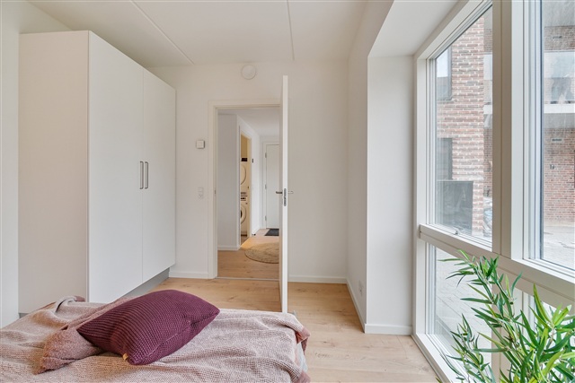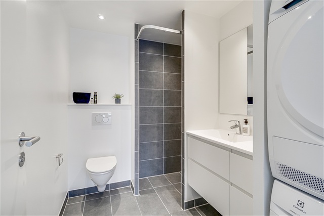 Ved indgangen til lejligheden mærker man straks den behagelige og indbydende atmosfære, skabt af det store lysindfald, som de mange vinduespartier sikrer. Hjemmet er tilrettelagt med fokus på stemning og funktionalitet, dækket af et ensartet gulv i alle rum undtagen badeværelset. Her er gulvet belagt med mørkegrå fliser, der fortsætter op i den murede bruseniche. Badeværelset er elegant indrettet med væghængt toilet, plads til vaskesøjle, samt et grebsfrit, hvidt møblement med indbygget håndvask. Køkkenet følger den samme stil med matchende elementer og en bordplade med en slank, sort kant, hvor de indbyggede hvidevarer bidrager til det harmoniske udtryk.