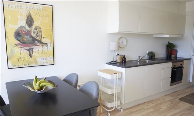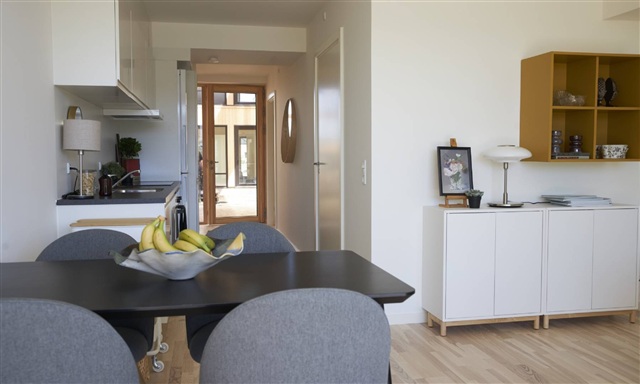 Denne lejlighed med to værelser indeholder et soveværelse, badeværelse samt et åbent, moderne køkken, der smelter sammen med en lys og indbydende stue. Badeværelset er indrettet med plads til en vaskesøjle, hvis dette ønskes, og køkkenet er udstyret med opvaskemaskine for øget komfort.Stuen åbner direkte ud til en privat terrasse, der vender ud mod de grønne område i Augusthaven, hvilket giver en fredfyldt udsigt. Lejlighedens forareal mod atriumhaven kan indrettes efter behov, eksempelvis med et cafébord eller nogle dekorative krukker, der skaber en hyggelig stemning.