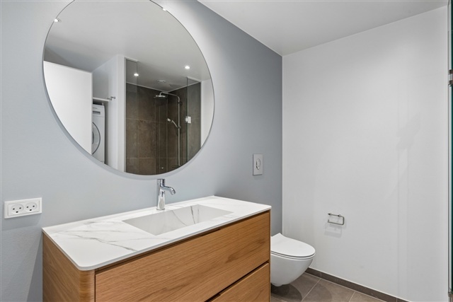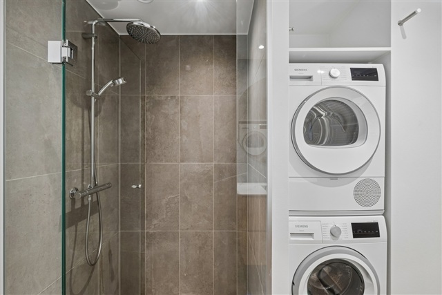 Badeværelset er udført med et enkelt, moderne look og indeholder en separat bruseniche samt en integreret vaskesøjle.