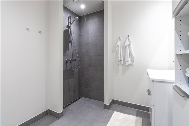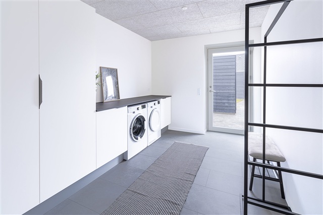 Entréen indeholder et praktisk integreret bryggers med vaskemaskine, tørretumbler og opbevaringsmuligheder, hvilket gør dagligdagen mere overskuelig. Badeværelset er udført i et stilrent, moderne design med lyse klinker, en separat bruseniche samt funktionelle detaljer, der harmonerer med husets velgennemtænkte stil. Fra køkken-alrummet er der adgang til egen terrasse og et overskueligt udeareal, som inviterer til at nyde sommermånederne i fredelige omgivelser. Foran boligen findes både et privat skur og en parkeringsplads med mulighed for at installere egen ladestander, samtidig med at der i kvarteret findes fælles ladestandere.