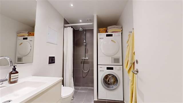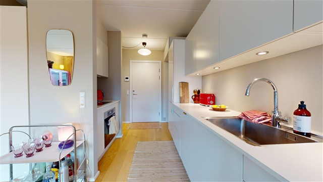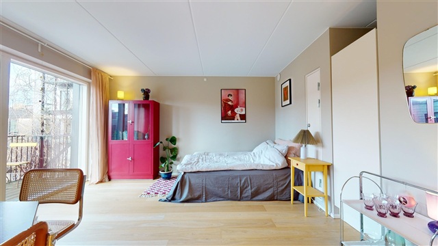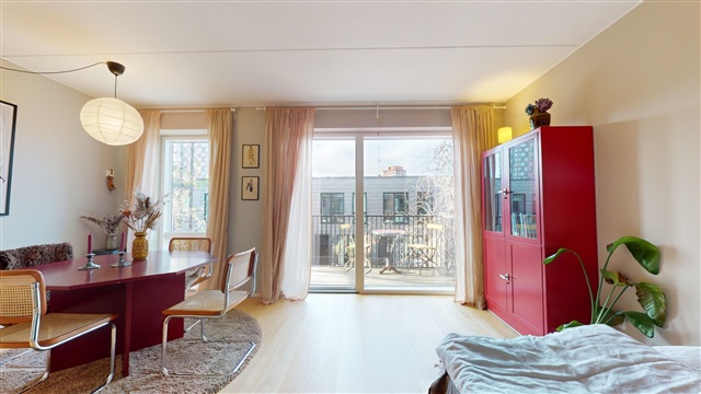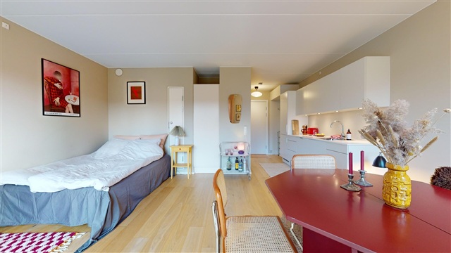 Lejligheden byder på en rummelig entré med tilstrækkelig plads til opbevaring af overtøj. Hjertet i boligen er det store og lyse opholdsrum, som muliggør en fleksibel indretning med separate områder til soveplads, spisebord og en hyggelig opholdsstue. De omfattende vinduespartier sørger for et rigt lysindfald, og den høje loftshøjde bidrager til en let og behagelig rumfornemmelse.Fra dette opholdsrum er der direkte adgang til en stor, dejlig altan, der fungerer som en naturlig forlængelse af boligen i sommermånederne. Her kan man nemt placere både spisebord, loungemøbler og planter, hvilket skaber en oplagt ramme for morgenkaffen, afslapning efter en lang dag eller gæstebesøg. Til lejligheden hører desuden et moderne og stilrent badeværelse, som er udstyret med materialer af høj kvalitet og gennemtænkte løsninger. En eksklusiv Miele vaskesøjle gør hverdagen lettere ved at give mulighed for effektiv og bekvem tøjvask i hjemmet.