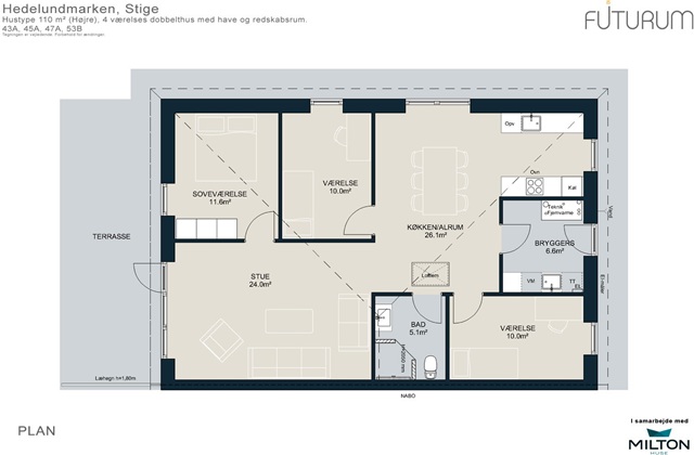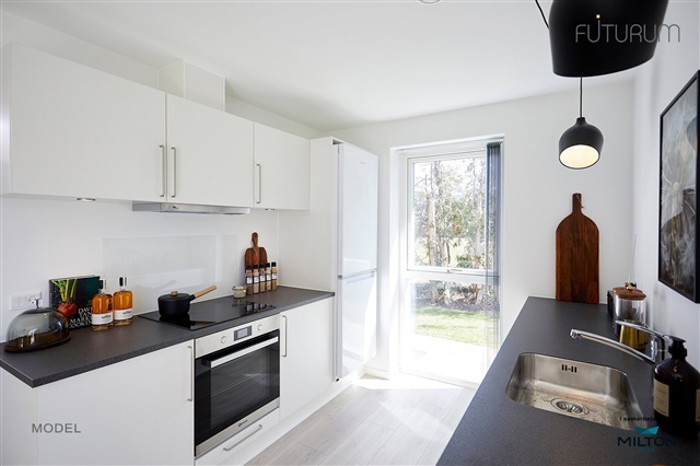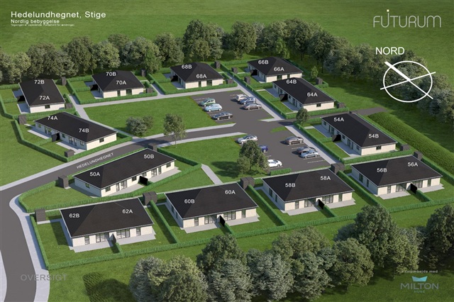 Dette moderne dobbelthus er indrettet med fokus på lys og åbenhed, hvor køkkenalrummet smelter sammen med en vinkelstue, der prydes af store gulv til loft-vinduer. Boligen indeholder et soveværelse med tre integrerede skabe, to yderligere værelser, et kombineret bryggers og entreområde samt et funktionelt badeværelse. Fra opholdsstuen er der adgang til en generøs terrasse, som fortsætter ud i en privat have med græsplæne. Til ejendommen hører desuden et eget redskabsskur på 7 m². Parkering sker på fælles areal, der ligger i umiddelbar nærhed af boligen. Forbruget af el, vand og varme afregnes direkte mellem lejer og de respektive forsyningsselskaber.Boligerne i Stige er designet med et rummeligt køkkenalrum, hvor inventaret fra HTH fremstår i en enkel hvid glat finish, og bordpladen er udført i skiferfarvet materiale med en indbygget stålvask. Køkkenet er udstyret med en kvalitetskogesektion, emfang samt opvaskemaskine, og der er forberedt plads til eget kølefryseskab, som lejer selv skal medbringe. På væggen bag komfuret sidder en let rengøringsvenlig glasstænklap. Køkken/alrummet går i ét med stuen, hvorfra en terrassedør fører ud til en stor terrasse belagt med fliser og den tilhørende græsplæne. Soveværelset har integrerede garderobeskabe fra HTH, mens de øvrige værelser har regulære størrelser. Entre og bryggers er udstyret med faste skabe i samme glatte hvide HTH-design, komplet med rustfri greb og en laminatbordplade i henholdsvis rustik skiferfarve med en rummelig stålvask. Der findes et aflåseligt teknikskab, og installation for vaskemaskine og tørretumbler er forberedt, men disse apparater skal lejer medbringe.