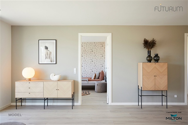 Billedmaterialet stammer fra udstillingshuse i området, og møbler følger ikke med i udlejningsaftalen. Vægge fremstår hvidmalede, og der tages forbehold for eventuelle rettelser.