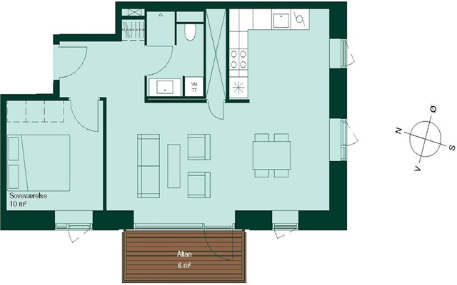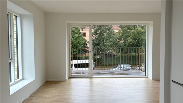 Boligen indledes med en entré, hvorfra der mod den ene side er adgang til soveværelset. Længere inde i lejligheden findes et badeværelse, som er udstyret med toilet, bruseniche samt en kombineret vaskemaskine og tørretumbler. Fra en tilstødende gang fører vejen til et rummeligt køkken og stueområde, der udgør en åben planløsning. Fra stueafsnittet er der udgang til en terrasse med orientering mod vest. Ejendommen er placeret i nærheden af gode indkøbsmuligheder, offentlig transport, skoler og daginstitutioner, ligesom der findes parker og grønne arealer i området.Bemærk venligst, at billederne ikke viser denne præcise lejlighed, men en anden med identisk plantegning.