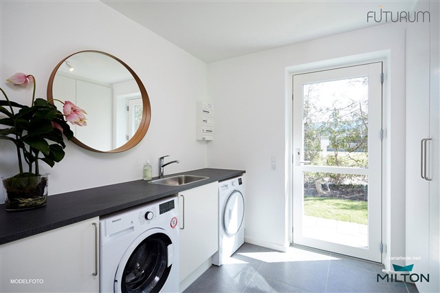 Indvendigt er køkken, bad, bryggers og soveværelser udstyret med moderne HTH-moduler med glatte, hvide fronter og rustfri greb. Bordpladerne er i slidstærkt laminat med en rustik skiferfarve, og der er en rummelig stålvask. Bag kogepladsen er der en stænkplade, som gør rengøringen lettere. Badeværelsesvasken er fremstillet af formstøbt materiale, toilet fra Ifö Sign, kvalitetsarmaturer fra den tyske leverandør Hans Grohe samt lineære afløb i brusenichen. Alle hvidevarer medfølger i anerkendt kvalitet, og der er tilrettelagt plads til vaskemaskine og tørretumbler i bryggerset, som lejer selv skal medbringe.