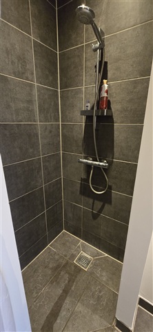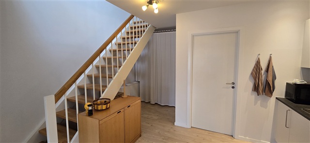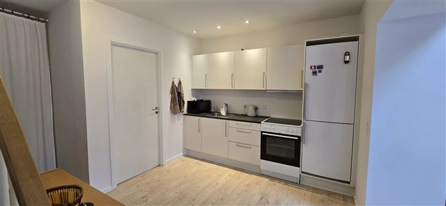 Indendørs finder man et lyst køkken-alrum i åben forbindelse med stuen, hvor et kvalitetskøkken fra HTH er indrettet med glaskeramisk kogeplade, emhætte samt et kombineret køle- og fryseskab. Badeværelset er udstyret med fliser, bruseniche, et væghængt toilet og en vask med underskab. Ejendommen råder over fælles vaskefaciliteter, og der er mulighed for parkering uden beregning.