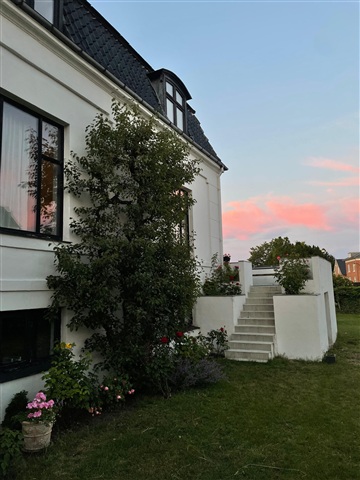 Stor have med frodig beplantning, solrig terrasse med udendørs spisegruppe og grill. Roser langs husets facade, stauder og sommerfuglebuske - haven blomstrer fra forår til efterår. Natbelysning skaber en magisk stemning om aftenen.