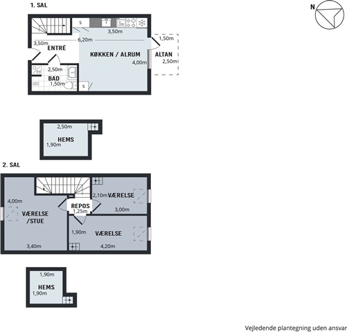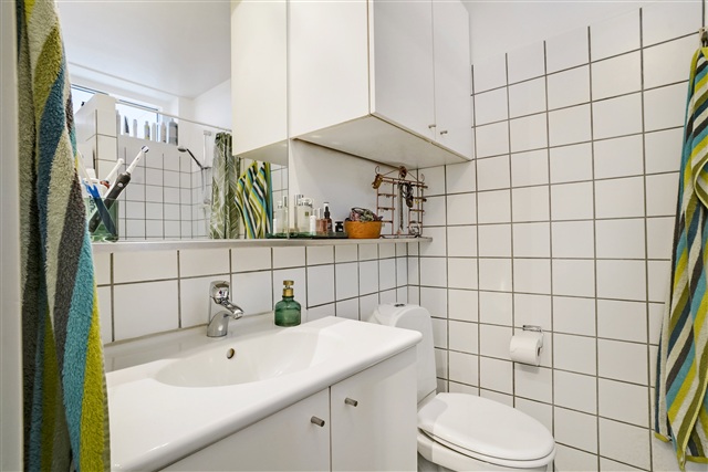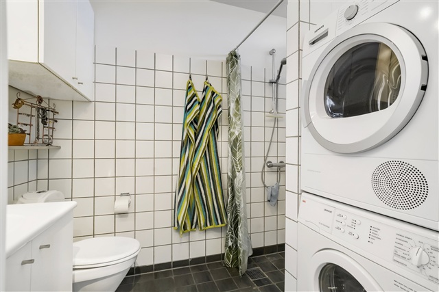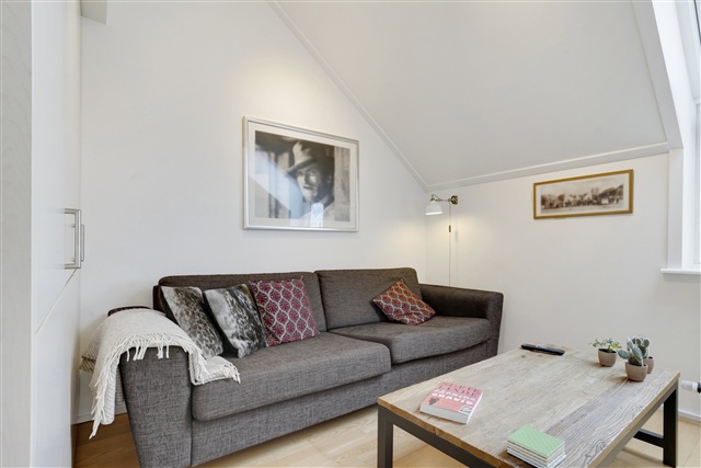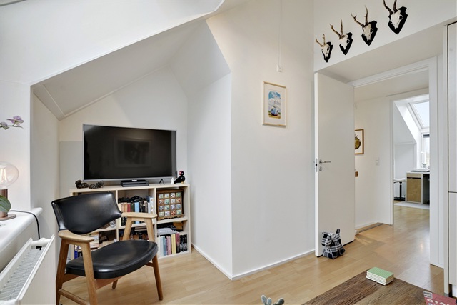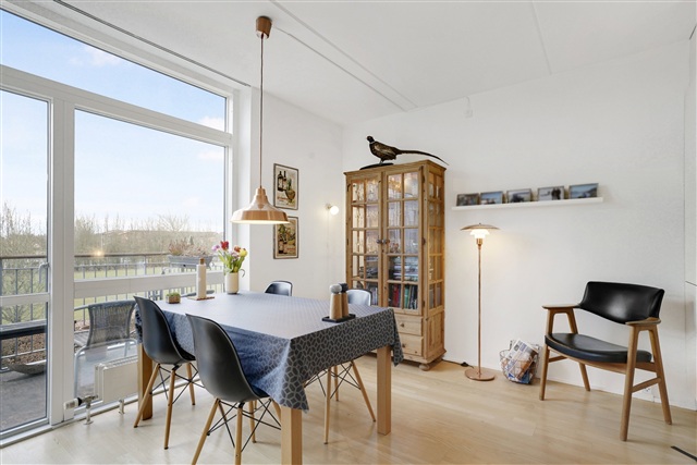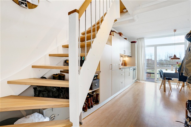 I stueetagen findes et åbent køkken-alrum, der er udstyret med alle nødvendige hårde hvidevarer, herunder kølefryseskab, ovn, kogeplade og opvaskemaskine. Badeværelset er forsynet med gulvvarme og en praktisk vaskesøjle. På første sal er der tre rummelige værelser, hvoraf to har en hems. Fra køkken-alrummet er der direkte udgang til en privat altan. Boligen rummer desuden et eget depotrum til opbevaring. Adgang til lejligheden kan ske både via elevator og trappe. Det er muligt at have en hund eller kat i boligen, dog kun efter forudgående aftale.