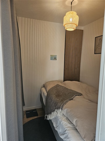 Lille men godt indrettet soveværelse med massere af opbevaring.