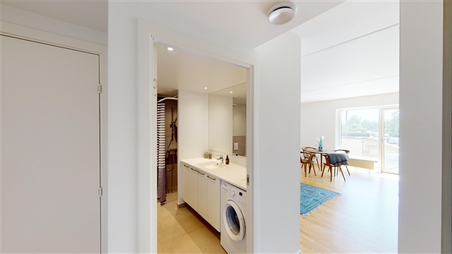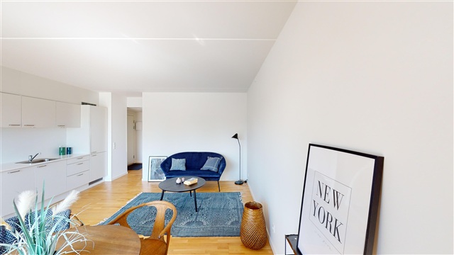 Lejlighederne i Erda 2 er udstyret med et moderne Invita-køkken, som inkluderer alle nødvendige hårde hvidevarer fra Siemens. Køkkenet er åbent integreret med stuen, hvilket giver en rummelig og tidssvarende atmosfære. Badeværelserne har varme i klinkegulvet, en stor bruseniche samt en integreret vaskemaskine. Både værelserne og opholdsrummene har smukke parketgulve, som skaber en elegant og sammenhængende helhed i hele boligens indretning.Ejendommen byder på en dejlig gårdhave med en lille legeplads, der skaber et hyggeligt udendørs miljø for beboerne. Til hver lejlighed hører et rummeligt depotrum i kælderen, hvor det også er muligt at leje en parkeringsplads med privat nedkørsel. Det er tilladt at holde ét kæledyr under 10 kilo i ejendommen efter tilladelse.