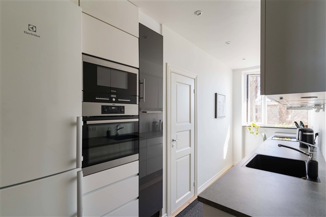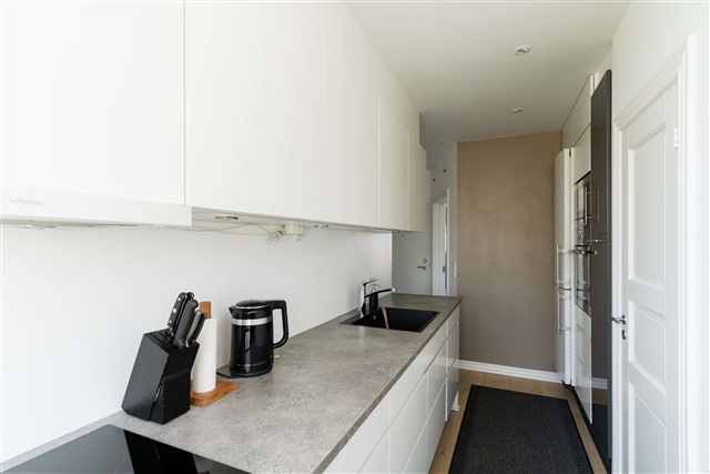 Køkkenet indeholder alle nødvendige hvidevarer, inklusive opvaskemaskine, og byder på gode opbevaringsmuligheder samt en funktionel arbejdsplads. Hele lejligheden er udstyret med gulvvarme i samtlige rum.
