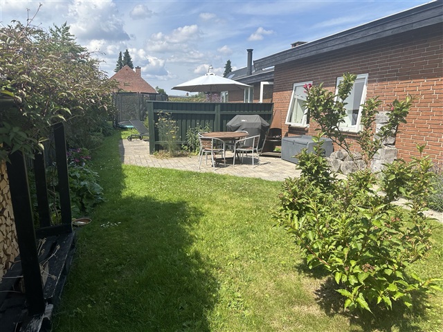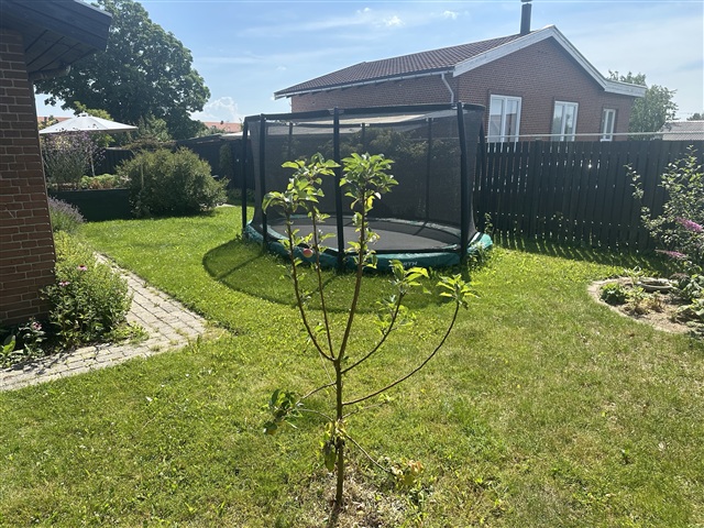Haven byder på masser af muligheder – med tre solrige terrasser, frugtbuske, æbletræer og stor nedgravet trampolin. Den er velegnet til både leg, ro og hyggelige stunder udendørs.