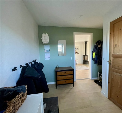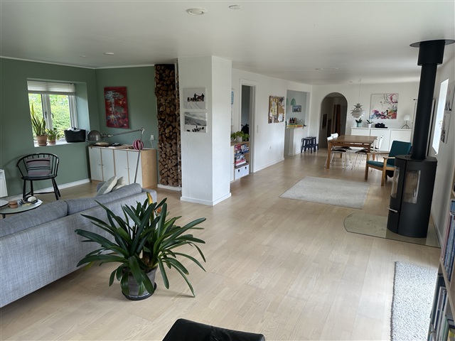 Indretningen er både funktionel og indbydende med et stort sammenhængende opholdsrum, hvor køkken, spisestue og sofaområde ligger i forlængelse af hinanden. Det lyse fællesrum fungerer som hjemmets naturlige samlingspunkt og indbyder til både samvær og afslapning. Her er også nyere brændeovn.