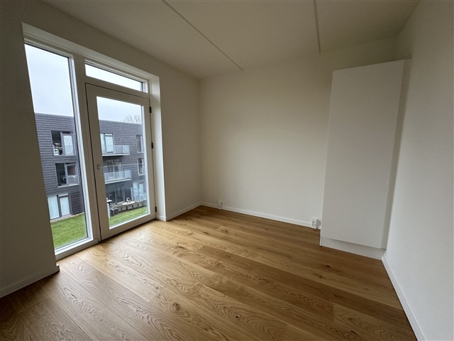 Soveværelset er rummeligt og indeholder faste skabe samt adgang til et depotrumsområde, der også kan anvendes som walk-in-closet og som har udgang til endnu en altan. Det tredje værelse egner sig til både børneværelse eller kontor og indeholder ligeledes faste skabe.