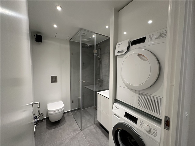 Lejligheden har et flot badeværelse med fliser, udstyret med bruseniche, armaturer og sanitetsartikler fra Grohe samt badeværelsesmøbler fra Duravit. Gulvvarmen sikrer komfort, og der er tilmed et bryggers med egen vaskemaskine og tørretumbler.