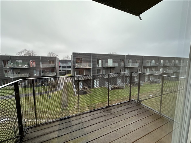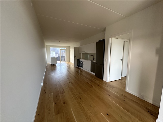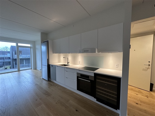 På 87 m² byder denne flotte 3-værelses lejlighed på adgang til en dejlig altan. Fra entréen træder man direkte ind i det rummelige opholdsrum, der kombinerer stue og køkken. Ved hoveddøren findes en diskret afskærmning til opbevaring af overtøj og fodtøj, som samtidig tillader lyset at strømme uhindret gennem det åbne rum.Opholdsområdet er et sammenhængende lokale med masser af naturligt lys. En del af rummet kan indrettes til spiseplads, mens den modsatte side egner sig til tv-hjørne. Køkkenet, placeret centralt, har en praktisk, mobil køkkenø på hjul, der kan flyttes efter behov. Designet er i mat hvid fra Designa og har en elegant corianbordplade. Alle hårde hvidevarer er i rustfrit stål og leveres af Miele, herunder også et vinkøleskab. Fra stuen er der udgang til en skøn altan, hvor man kan nyde udsigten.