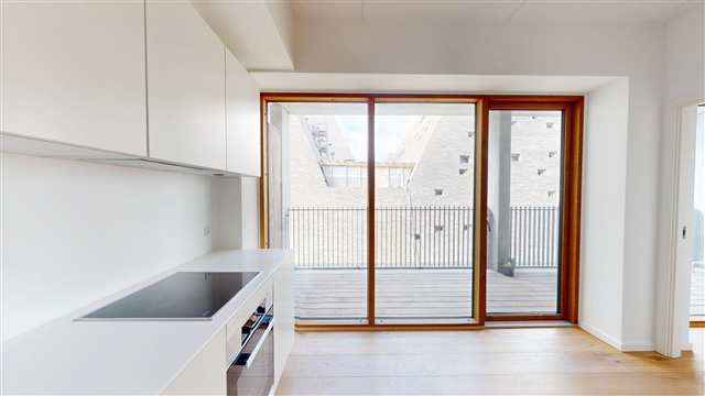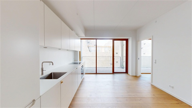 Denne bolig præsenterer sig med en enkel og raffineret stil, hvor kvalitetsmaterialer og en gennemtænkt planløsning sikrer, at pladsen udnyttes fuldt ud. Det lyse køkken-alrum, som udgør hjemmets naturlige centrum, byder på store vinduespartier, der skaber en åben atmosfære samt et behageligt lysindfald. Køkkenet er designet med fokus på et minimalistisk udtryk, der samtidig rummer gode arbejdsforhold og rigelig plads til opbevaring.Fra opholdsrummet åbnes der direkte ud til en stor og indbydende terrasse, der fungerer som en forlængelse af boligen og tilbyder en dejlig udsigt over Københavns havn. Terrassen er velegnet til både morgenkaffen, rolige stunder samt lange sommeraftener med udsigt til vandet. Soveværelset er skabt som et fredeligt opholdsrum med plads til en dobbeltseng og nødvendige opbevaringsløsninger. Badeværelset fremstår eksklusivt med stilrene materialer og en separat bruseniche, som bidrager til en elegant finish.
