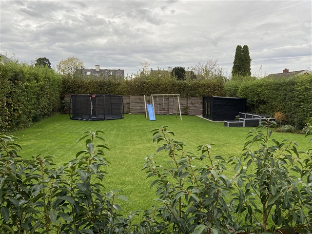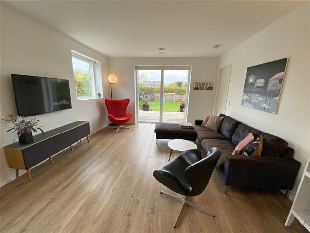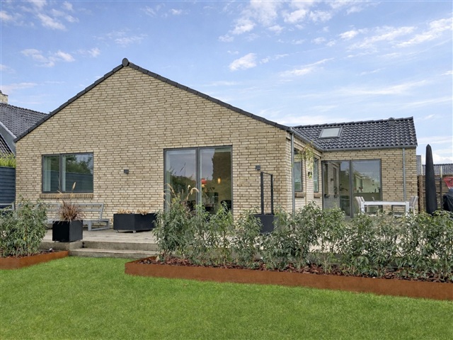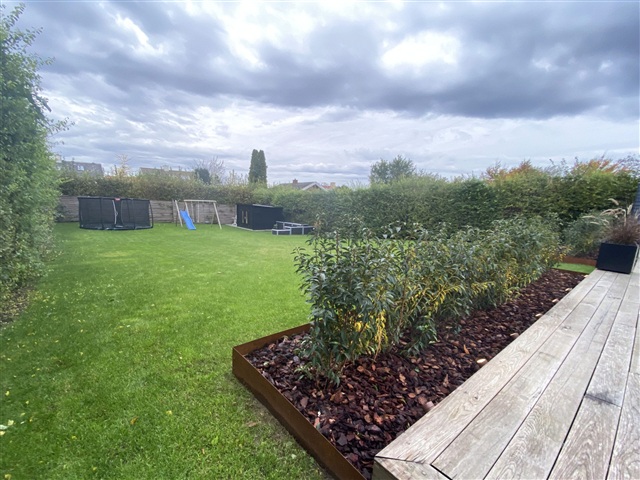 Udenfor breder haven sig med en stor græsplæne, trampolin og legestativ, hvor der er plads til leg og aktivitet. Rundt om huset finder man den store træterrasse, og derudover er der en nyttehave, som indbyder til at dyrke sæsonens frugter og grøntsager.