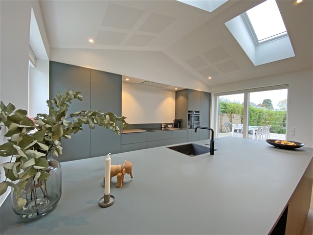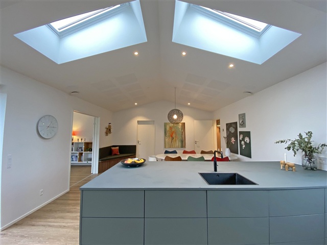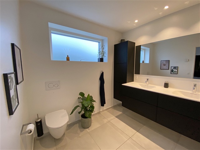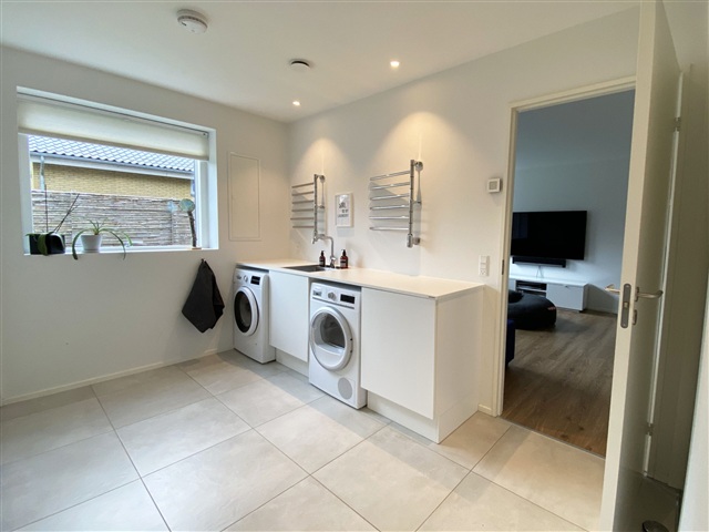 Denne rummelige villa på 212 kvadratmeter, suppleret med en carport på 35 kvadratmeter, blev opført i 2020 af Eurodan Huse med stor vægt på funktionalitet og detaljer, der skal gøre hverdagen så nem som mulig. Boligen er placeret i det attraktive Kollelev Mose-område, hvor både Virum Skole og Furesøen befinder sig i nærområdet. Desuden findes shoppingmuligheder og caféer tæt på på Virum Torv og Holte Midtpunkt. Der er gode transportforbindelser til København C med S-tog, som når frem på mellem 20 og 25 minutter.Indretningen rummer en rummelig entré med indbyggede skabe, en afdeling med tre værelser, et multirum samt et badeværelse udstyret med bruseniche. I forlængelse heraf er der et stort bryggers med vaskefaciliteter. Hjertet i boligen er det åbne køkken-alrum, som har loft til kip og flere ovenlysvinduer, og som leder direkte ud til en stor træterrasse. Også stuen, der ligger i åben forbindelse med køkkenet, har døre ud til haven og giver hyggelige opholdsmuligheder. Husets masterafdeling består af et soveværelse med walk-in-closet og et stort badeværelse med dobbelte brusere. Derudover er der et mindre kontor til rådighed.
