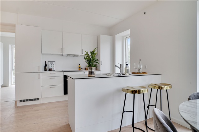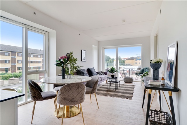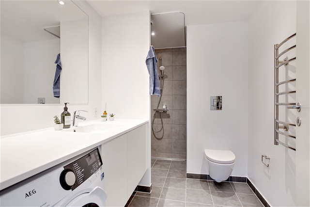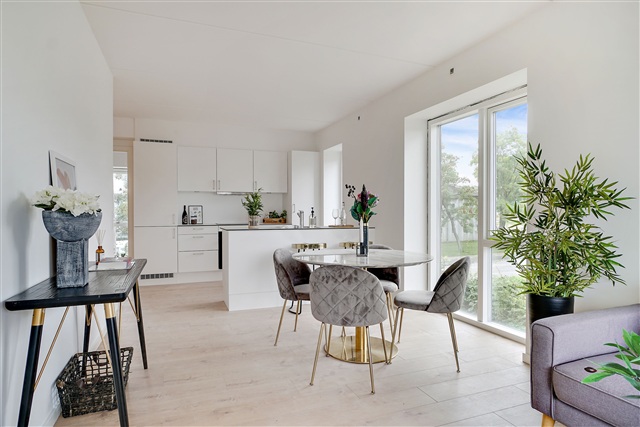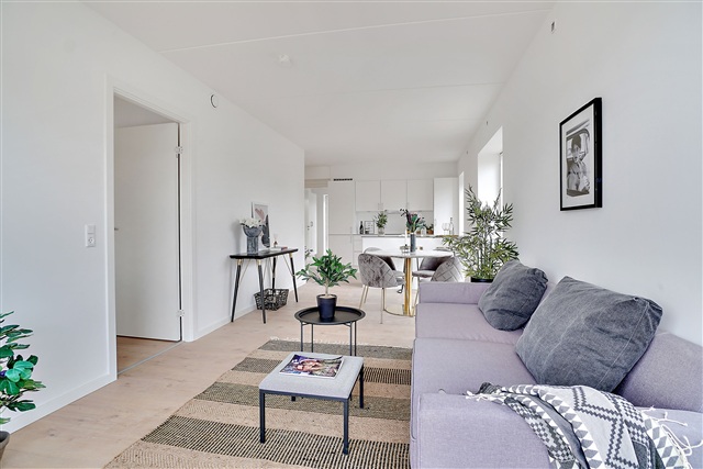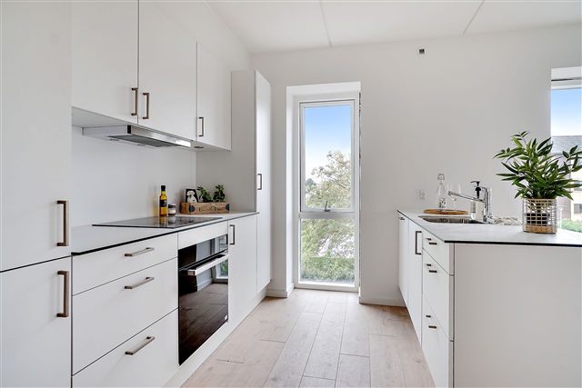 Denne moderne treværelses lejlighed i Frederikssund byder på en velindrettet planløsning, der både passer til singler, par og mindre familier. Boligen er placeret centralt, hvilket giver nem adgang til dagligdagens fornødenheder samt offentlig transport. Herfra er det muligt at gå til dagligvarebutikker, specialforretninger og Frederikssund Station med S-tog inden for en radius på under en kilometer. For børnefamilier ligger både skole og daginstitutioner mindre end 500 meter fra ejendommen, mens shoppingmulighederne i Sillebroen også findes tæt på. Området er omgivet af naturskønne områder, herunder Fjordstien langs Isefjord og Roskilde Fjord, som indbyder til udflugter og udendørsaktiviteter.Indenfor præsenterer lejligheden sig med et lyst og stilrent design, hvor naturligt lys spiller en afgørende rolle. Entréen leder ind til et gennemgående lyst gulv, som findes i alle rum undtagen badeværelset. Badeværelset er beklædt med lysegrå klinker på gulvet og i den murede bruseniche, som er udstyret med linjeafløb. Herudover findes et væghængt toilet samt et hvidt badeværelsesmøbel med indbygget vask og plads til vaskefaciliteter. Fra entréen bevæger man sig videre ind i det åbne plan, hvor køkken og stue flyder sammen. Køkkenet er indrettet med to parallelle rækker af hvide skabe og matchende bordplader samt integrerede hårde hvidevarer, der understøtter det strømlinede udtryk. Fra køkkenøens håndvask er der udsigt til spiseområdet og stuen med bløde møbler. Boligen byder endvidere på to gode værelser, hvor begge har indbyggede skabe.
