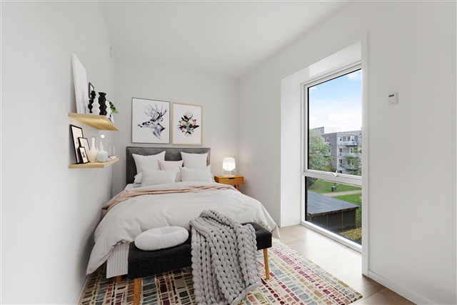 Lejligheden er kendetegnet ved sit luftige og indbydende præg, hvor den åbne planløsning skaber et naturligt samlingspunkt i form af køkkenalrummet. Ved indgangen til boligen mødes man af et lyst og moderne køkken, der er udstyret med en komplet hvidvarepakke. Køkkenets åbne design gør det ideelt til både socialt samvær og madlavning, og det integreres harmonisk med spisestueområdet, som ubesværet kan indrettes med et spisebord, hvilket muliggør en sammenhængende indretning af både spiseplads og opholdsstue i ét rum.Store vinduespartier sikrer et rigt tilstrømning af dagslys, der bidrager til en varm og imødekommende stemning i rummet. Boligen rummer tre store soveværelser, som alle tilbyder gode muligheder for personlig indretning og fleksibel anvendelse.