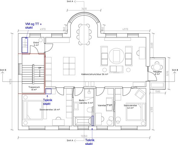 Badeværelset fremstår rummeligt og praktisk indrettet, med en vaskesøjle installeret, og der er gode muligheder for at tilpasse indretningen efter egne ønsker.
