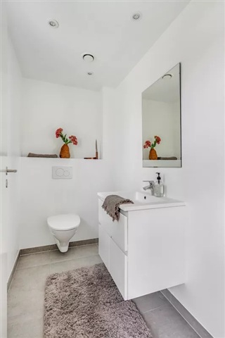 I Ishøj Landsby tilbydes boliger, hvor både indre og ydre detaljer er udført med fokus på kvalitet. Når man træder ind gennem boligens entré, får man adgang til et badeværelse med bruseniche samt et værelse. Køkken-alrummet ligger i forbindelse med en stor og lys stue, som åbner direkte ud til en privat have og terrasse. Haven er afgrænset af en hæk mod naboen og områdets fællesarealer.Køkkenet er lyst og udstyret med komplette hårde hvidevarer fra Siemens, herunder induktionskogeplade, opvaskemaskine, integreret køle-fryseskab og indbygningsovn. Fra stuen fører en trappe op til en åben repos på første sal, som fungerer som et lyst aktivitetsområde med god garderobeplads. Vinduet her sørger for et dejligt lysindfald til boligens øverste etage. Reposen forbinder soveværelset samt et stort ekstra værelse. På samme etage findes et rummeligt badeværelse med vægmonteret toilet, en lukket bruseniche med glasdør samt en kombineret vaskemaskine og tørretumbler.