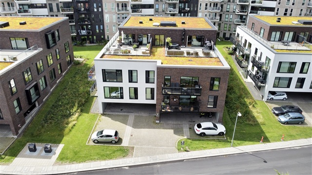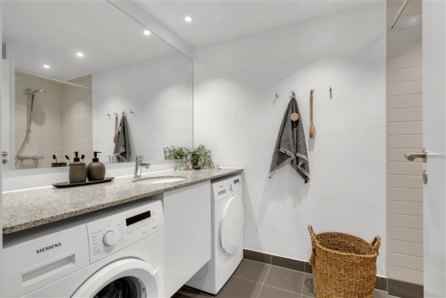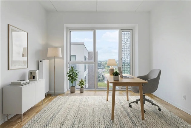 I det eftertragtede område Risskov præsenteres en lejlighed med en velovervejet indretning, der indeholder et rummeligt opholdsrum samt regulære værelser, hvilket gør boligen velegnet til både par, familier og dem, der har behov for ekstra plads til kontorarbejde eller hobbyaktiviteter. Boligens centrale samlingspunkt er det åbne køkken-alrum, hvor et elegant, hvidt køkken med en køkkenø danner rammen om både madlavning og hygge. Her er der rigelig plads til et spisebord og en behagelig sofagruppe, og de store gulv-til-loft-vinduer lukker et naturligt og behageligt dagslys ind i hele rummet.Fra opholdsmiljøet får man adgang til en skøn tagterrasse, som bidrager til boligens attraktive udendørsfaciliteter. Værelserne er lyse og nemme at indrette, prydet med gennemgående lyse trægulve, og samtlige rum har indbyggede garderobeskabe, der tilfører praktisk opbevaringsplads uden at optage værdifuld gulvareal. Badeværelset fremstår moderne og veludnyttet med grå klinker på gulvet, en separat bruseniche og en væghængt installation.