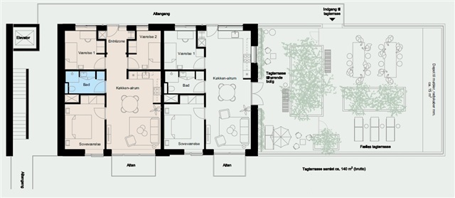 Denne rummelige penthouselejlighed byder på fire gode værelser og en unik loftshøjde med kiploft samt ovenlysvinduer, der skaber en imponerende oplevelse af rum og lys. Boligen indeholder en entré med integreret garderobe, et moderne badeværelse med plads til vaskesøjle og tre velindrettede værelser. Køkkenet er udført i et stilfuldt Svanekøkken med hvide fronter, en mørk bordplade, en hævet ovn og induktionskogeplade, som ligger i åben forbindelse med både alrum og stue. Fra stuen er der udgang til en omfattende fælles tagterrasse, hvorfra man kan nyde en panoramisk udsigt over byens tage og solens sidste stråler om aftenen. Gennem hele lejligheden er der installeret gulvvarme med individuel regulering, og de store vinduespartier sikrer et gennemstrømmende dagslys helt ned til gulvet. En bolig, der forener høj komfort, elegant design og en af ejendommens bedste udsigter.
