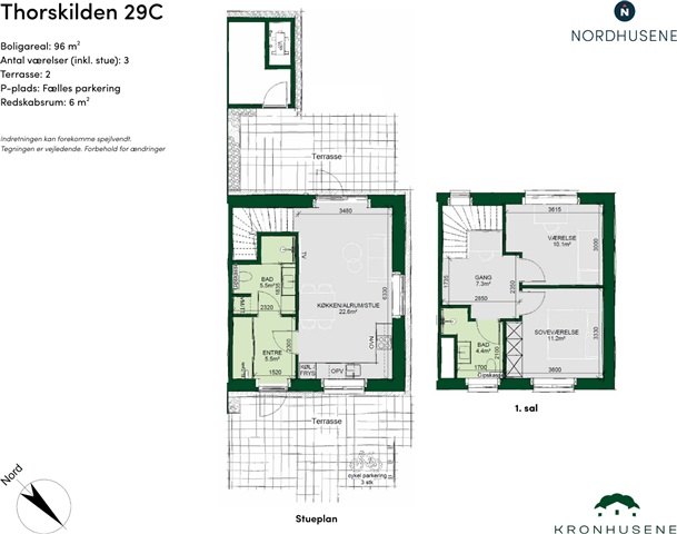 Dette rækkehus, fordelt på to etager, kombinerer komfort med praktiske løsninger og et tidssvarende design. Boligen rummer 96 m² og byder på et gennemlyst og veludnyttet rumforløb, der tilgodeser både par og små familier med behov for plads og funktionalitet. Hjemmets atmosfære præges af gennemtænkte detaljer og et behageligt dagslys, der skaber både harmoni og rumlighed.I stueetagen mødes man af en rummelig entré, som fungerer som indgang med adgang til et badeværelse samt opbevaringsmuligheder. Sammenhængen mellem køkken, spisestue og opholdsstue danner et stort fællesområde på over 24 m², der giver rig plads til både spisebord og sofahjørne. Herfra er der direkte adgang til en af de to terrasser, hvilket gør det nemt at inddrage udearealerne som en naturlig forlængelse af hjemmet. Første sal er dedikeret til soveafdelingen, som består af et stort soveværelse med indbyggede skabe, et ekstra værelse velegnet som kontor, børneværelse eller gæsterum, et lyst badeværelse med separat bruseniche samt en fordelingsgang, der skaber sammenhæng mellem rummene.