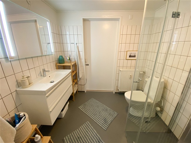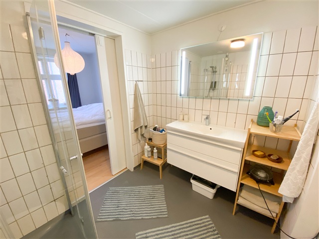 Denne lejlighed fremstår både lys og rummelig med en god indretning. Når man træder indenfor, ankommer man til en entré, hvor der er plads til både overtøj og fodtøj, inden man fortsætter videre ind i boligen. Herfra er der også adgang til det ene badeværelse. Bygningen er designet med hensyn til både ældre og handicappede og har derfor to separate indgange, hvor det naturligvis er muligt at aflåse den ene og eventuelt placere en kommode eller lignende foran. For enden af entréen åbner den store stue sig op med rigelig gulvplads og store vinduespartier, som sikrer et flot lysindfald. Stuen rummer flere møbleringsmuligheder og har plads til både sofa, TV-møbler og et spisebord. Fra stuen er der forbindelse til køkkenet, som er udstyret med moderne og flotte materialer. Her findes både en integreret opvaskemaskine, og ovnen er placeret i en behagelig arbejdshøjde, så man undgår at skulle bukke sig. I et hjørne af køkkenet er plads til et spisebord, som også fremgår på billederne.Lejlighedens værelse er stort og rummeligt og indeholder i forvejen et garderobeskab. Herfra er der ydermere adgang til badeværelset, der dermed fungerer som både gæste- og soveværelsesbad.