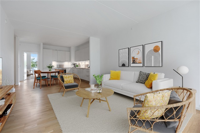 Denne rummelige og moderne lejlighed med fire værelser er indrettet i en bygning, hvor loftshøjden bidrager til en følelse af både luft og elegance.Køkken-alrummet fungerer som det centrale samlingssted for både familie og gæster. Det moderne køkken prydes af hvide fronter med greb i stål, som tilsammen skaber et tidløst og stilrent udtryk. Med en hvid bordplade fremstår køkkenet lyst og indbydende. Arealet er åbent og giver god plads til bevægelse, hvilket fremmer både madlavning og hyggeligt samvær.