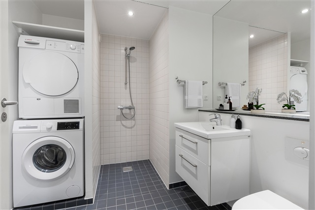 Lejlighedens tre soveværelser har en god størrelse med store gulv til loft-vinduer, der sikrer et generøst lysindfald og en åben fornemmelse. Der er rig mulighed for at indrette med såvel seng som opbevaringsløsninger, hvilket gør rummene funktionelle og behagelige.