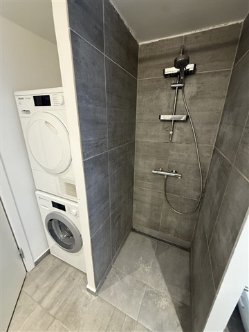 Badeværelset er praktisk indrettet og indeholder både vaskemaskine og tørretumbler.