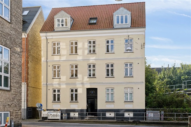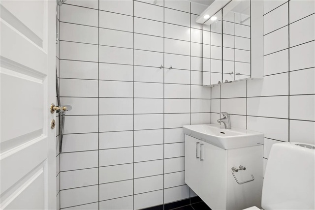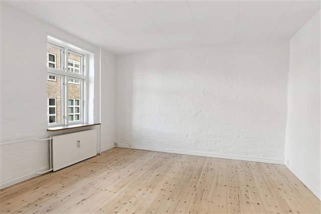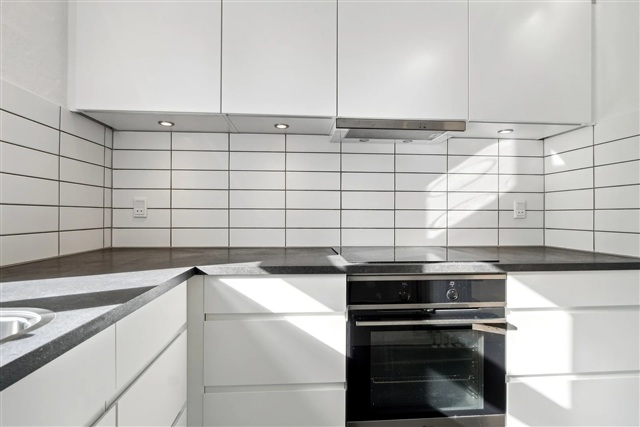 Denne lejlighed kombinerer en lys og veludført boligoplevelse med en attraktiv placering. Den er klar til indflytning og byder på en indbydende atmosfære, der understreger boligens kvalitet.Planløsningen er praktisk udformet, idet køkkenet fungerer som centrum med adgang til stue, soveværelse og badeværelse. Stuen fremstår både rummelig og inviterende, takket være store vinduespartier, som lader en behagelig mængde dagslys strømme ind. De hvide murstensvægge sammen med lyse plankegulve udgør en neutral og harmonisk baggrund. Soveværelset er udstyret med et skydelågeskab, der tilbyder god opbevaringsplads. Køkkenet er stilrent og moderne med grebsfri fronter og en mørk bordplade. Det indeholder køle-/fryseskab, keramisk kogeplade, indbygningsovn, emhætte samt opvaskemaskine, og integrerede spots under overskabene sikrer tilstrækkeligt arbejdslys. Badeværelset fremstår simpelt men velholdt med hvide fliser, gulvvarme og en bruseniche med gulvafløb.